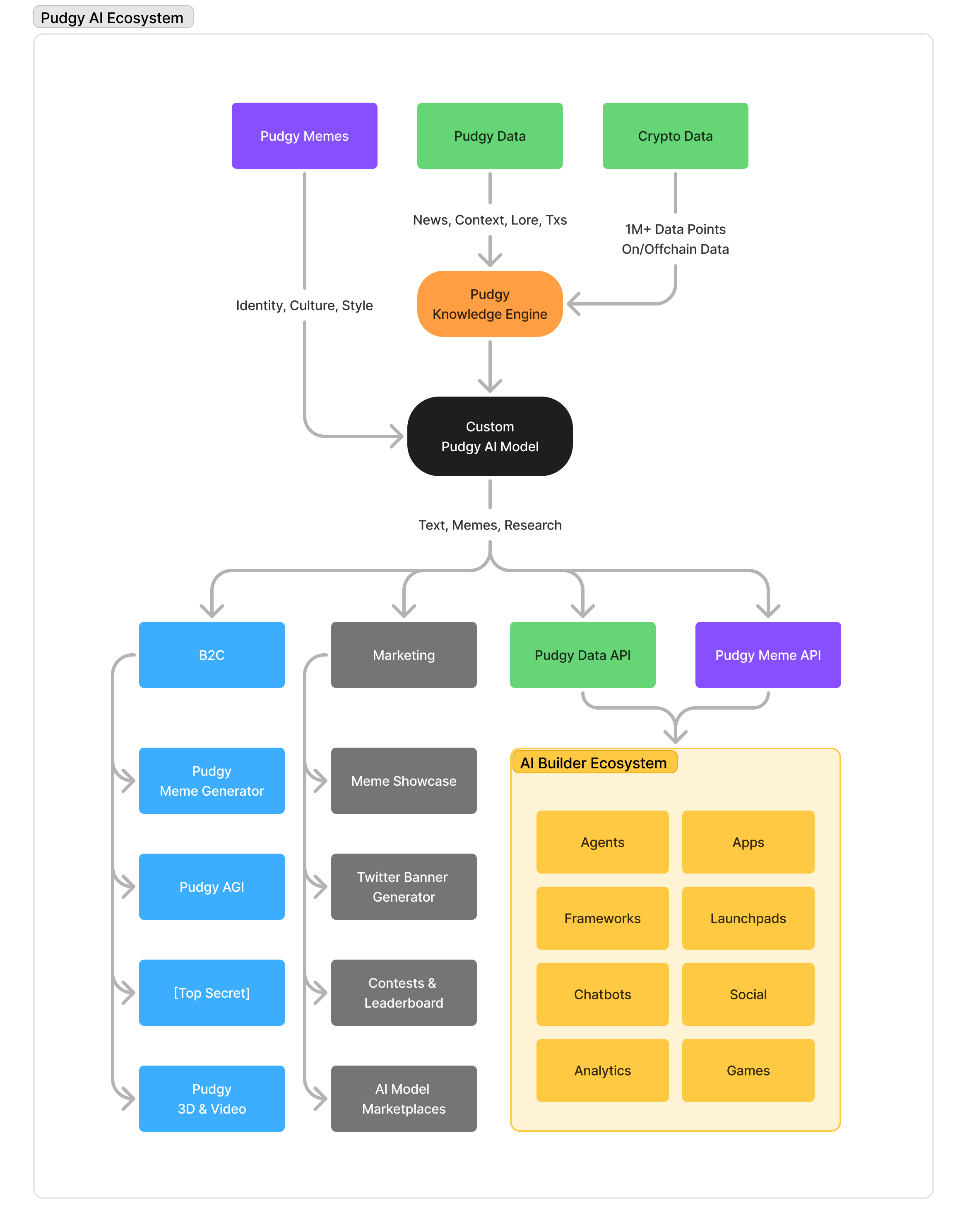 Pudgy memes, news, and onchain data all converge into one Pudgy AI model, powering text, memes, and research across bots, agents, applications, social feeds, games, and virtually any front end.