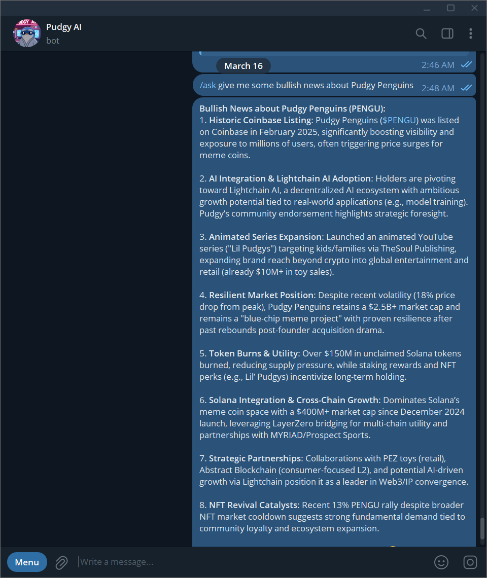 Try the Pudgy AI Bot now on Telegram. V3 model and video coming soon.